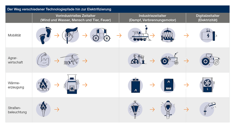 Die Nutzung von Strom hat andere Arten des Antriebs bisher nicht vollkommen verdrängt. Doch die Entwicklungen in unterschiedlichen Bereichen zeigen, dass Elektrifizierung der Weg in die Zukunft sein wird. In der Industrie wurden Dampfmaschinen durch Elektromotoren abgelöst. Öllampen gehören dank elektrischer Beleuchtung der Vergangenheit an, und in der Mobilität sollen in Zukunft Elektromotoren den Verbrennungsmotor ablösen.
