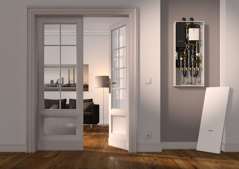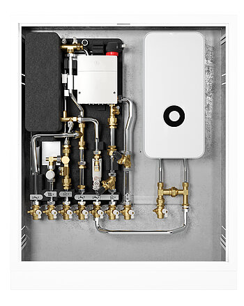 Optional können Installateure den nachgeschalteten elektrischen Durchlauferhitzer ergänzen und zusammen mit den weiteren Komponenten in einem Unterputz- oder Aufputzschrank installieren. Vorteilhaft insbesondere für den Neubau ist die geringe Installationstiefe des Unterputzschrankes von nur 150 Millimetern, in dem auch Zubehöre wie Heizkreisverteiler für eine Fußbodenheizung und eine Zirkulationspumpe Platz finden.