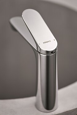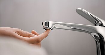 Der optionale Kaltstart bei der top-bedienten Variante trägt darüber hinaus zu einem reduzierten Energieverbrauch bei. Denn: Im Regelfall steht der Hebel einer Armatur in der Mittelstellung. Wird nun bei einer herkömmlichen Armatur der Hebel geöffnet, wird automatisch Warmwasser entnommen – ob dieses benötigt wird oder nicht. Bei einer Armatur mit Kaltstartfunktion ist dies nicht der Fall. Denn beim Öffnen des Hahns in der Mittelstellung wird das Wasser nicht sofort gemischt, sondern erst, wenn der Hebel bewusst gedreht und Warmwasser tatsächlich benötigt wird. Auf diese Weise lässt sich der Warmwasserverbrauch um bis zu 53% senken.