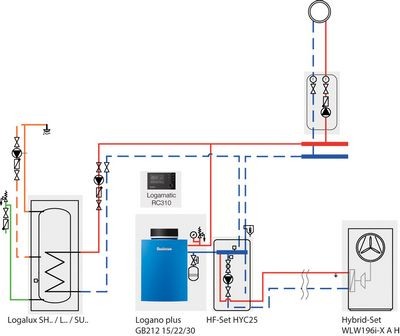 „Unser Ziel bei der Modernisierung war, mit dem Wärmepumpen-Hybridsystem Logano plus GBH212 auf eine klimaschonende Wärmeerzeugung umzusteigen“, sagt Anlagenbetreiber Hipp. Der Hybridmanager HM200 übernimmt dabei sozusagen die Rolle des Regisseurs – er regelt das System und bindet die Wärmepumpe in das Regelsystem Logamatic EMS plus des Heizsystems ein. Abhängig von der eingestellten Regelungsstrategie entscheidet der Hybridmanager, ob die Wärmepumpe und/oder der Gas-Brennwertkessel die Wärme bereitstellen soll. Die Logamatic EMS plus sperrt oder gibt den konventionellen Wärmeerzeuger dann dafür frei, so sind Gas-Brennwertkessel und Wärmepumpe immer optimal eingestellt.