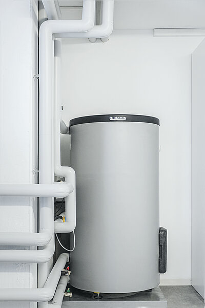 Mit dem nebenstehenden Warmwasserspeicher Logalux SH290 RS hat das Ehepaar Hipp immer genügend warmes Wasser. Bei der Trinkwasserhygiene erfüllt der integrierte Glattrohr-Wärmetauscher höchste Ansprüche. Die Thermoglasur DUOCLEAN plus versiegelt alle Flächen, die mit Trinkwasser in Kontakt kommen – das verhindert Ablagerungen und schützt vor Korrosion. Durch den großflächigen Doppelwendel-Wärmetauscher ist der Logalux SH290 RS besonders leistungsfähig. Er lässt sich über die vorne liegende Öffnung komfortabel reinigen.