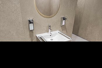 Dieses kontrastierende Prinzip findet sich auch an den Haltegriffen mit integriertem Farbstreifen der MEDCARE Waschtische und der basaltgrauen Beschichtung am Hebelende der F4LT-Med Stand- und Wandbatterien für Patienten- und Pflegebäder von KWC Professional wieder.