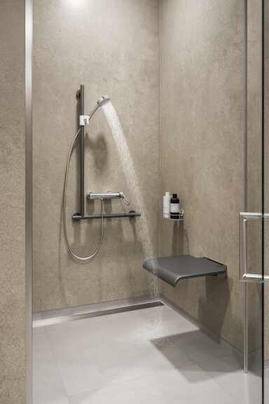 Die Stütz- und Haltegriffe in Basaltgrau überzeugen mit angenehmer Haptik und einem gut zu greifenden, ergonomischen Durchmesser von 32 mm. Neben Haltegriffen in verschiedenen Längen gehören ein 90° Winkelgriff und WC-Stützklappgriffe zum Programm. Beim Winkelgriff mit Handbrausehalterung und dem WC-Stützklappgriff mit Spülauslösung bieten die Funktionskomponenten in Weiß eine visuelle Orientierung für die Nutzer*innen nach dem bewährten 2-Sinne-Prinzip.