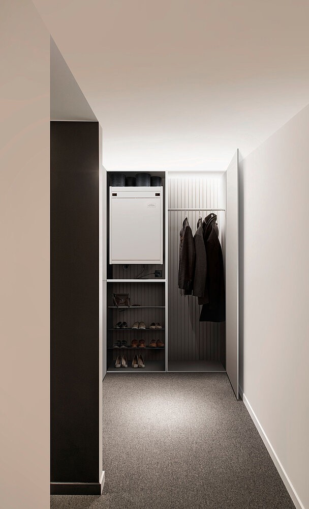 Das leistungsstarke, zentrale Lüftungsgerät x-well C225 ist konzipiert für Wohnflächen mit bis zu 160 m2. Dank kompakter Abmessungen sowie praktischer Anschlussvarianten kann es einfach und platzsparend in Küchen- oder Dielenschränken untergebracht werden. Bilder: Kermi GmbH