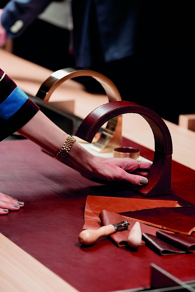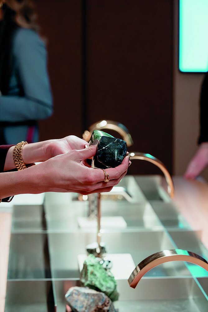 Design zum Anfassen: Vor Ort konnten Gäste Edelsteine wie Sodalith und Verdit oder feinstes Leder hautnah erleben – und so ihrer individuellen Vision einer Armatur Ausdruck verleihen. Copyright: Dornbracht