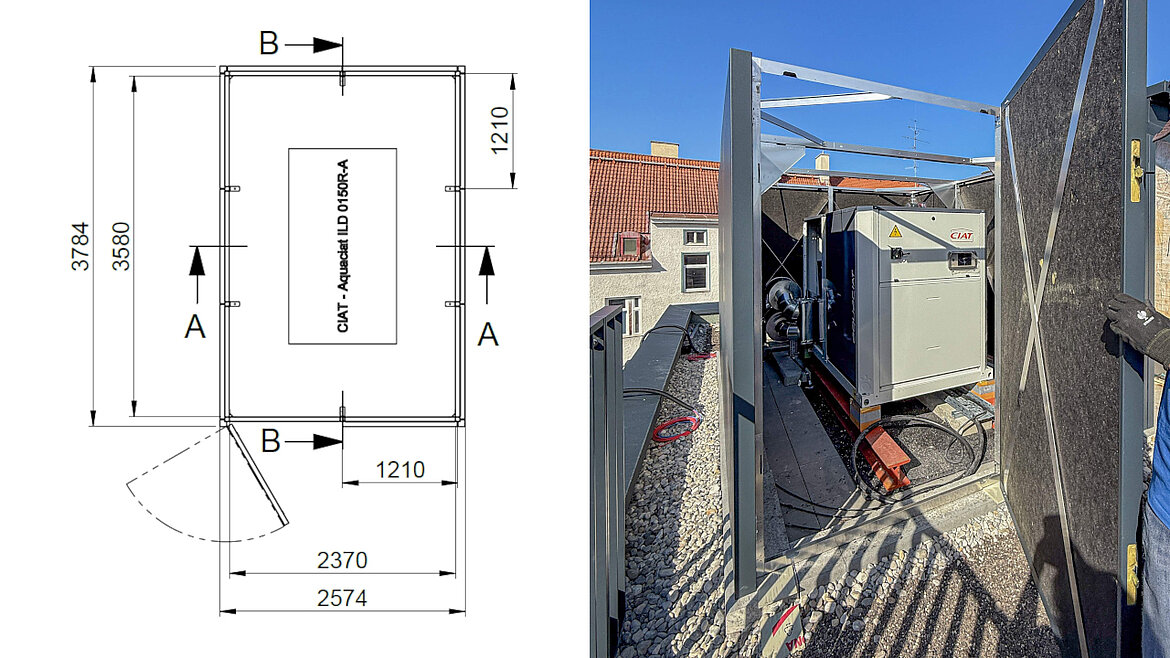 Eine passende Ausführung der Schallschutzvorrichtung war mit der TA Lärm-basierten ATEC-Software schnell ermittelt: Der zu ummantelnde Kaltwassersatz hat standardmäßig einen Schallleistungspegel von 77 dB(A). Im Mischgebiet gelten jedoch Lärmgrenzen von 60/45 dB(A) (tags/nachts). Kalkuliert man „vorbelastenden“ Umgebungslärm von 6 dB(A) mit ein, darf das Gerät nur noch 54/39 dB(A) abgeben – bei Abständen zum Nachbargebäude von mindestens 3 m. Schallschutzwände vom Typ eSILENT SW20 in 100 mm Dämpfstärke erfüllen diese Anforderungen.
