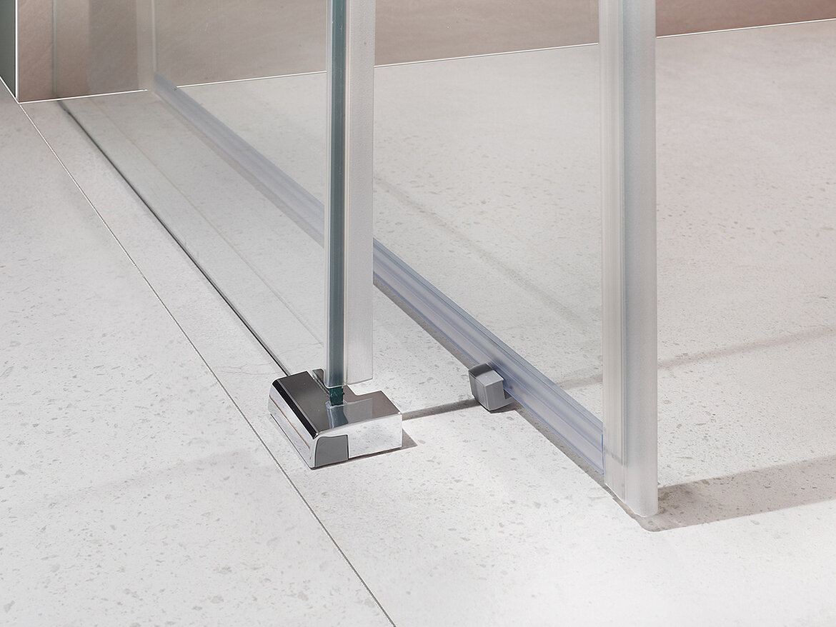 Das Herzstück der neuen Schiebetür-Serie MOVE ist die patentierte Tür-Führungseinheit. Diese ist besonders schmal und dezent ausgeführt. Ein daran mit Magnet fixierter Anker führt die Tür ruhig und sicher beim Öffnen und Schließen - ganz ohne Metallschienen am Türteil oder am Boden. Zum Reinigen wird das Türteil einfach mitsamt dem Anker weggeschwenkt.