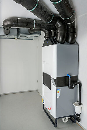 Zwar bieten moderne Häuser, die gut gedämmt sind, ein hohes Maß an energetischen Einsparungen und schützen kurzfristig vor dem Eindringen von äußerer Hitze. Wenn allerdings die Hitze ungefähr fünf Tage anhält, dringt diese auch in die Innenräume, unabhängig davon, ob man mit Beschattung und anderen Maßnahmen versucht, den Prozess aufzuhalten. Somit entsteht innerhalb der Wohnräume eine belastende Hitze. Daher wurde die Nachrüstung einer Lösung mit Kühlfunktion immer dringender. Die Gründe seines Entscheidungsprozesses nennt Schaffer wie folgt: „Natürlich hätten wir auch eine klassische Split-Klimaanlage installieren können. Allerdings hätten wir hierzu das Außenmodul an der Außenwand montieren müssen, was aber unsere schöne Hausfassade zerstört hätte. Wir wollten auch keine Kühlmodule auf dem Flachdach montieren, um einen aufwendigen Dachdurchbruch zu vermeiden. Gott sei Dank lag die Lösung bereits vor unseren Augen. Denn wir montierten einfach eine Kühleinheit auf das unten im Keller stehende Lüftungsgerät und konnten damit ganz bequem die vorhandenen Zu- und Abluftleitungen für die Lüftung und Temperierung weiter benutzen. Das war eindeutig die beste Alternative.“