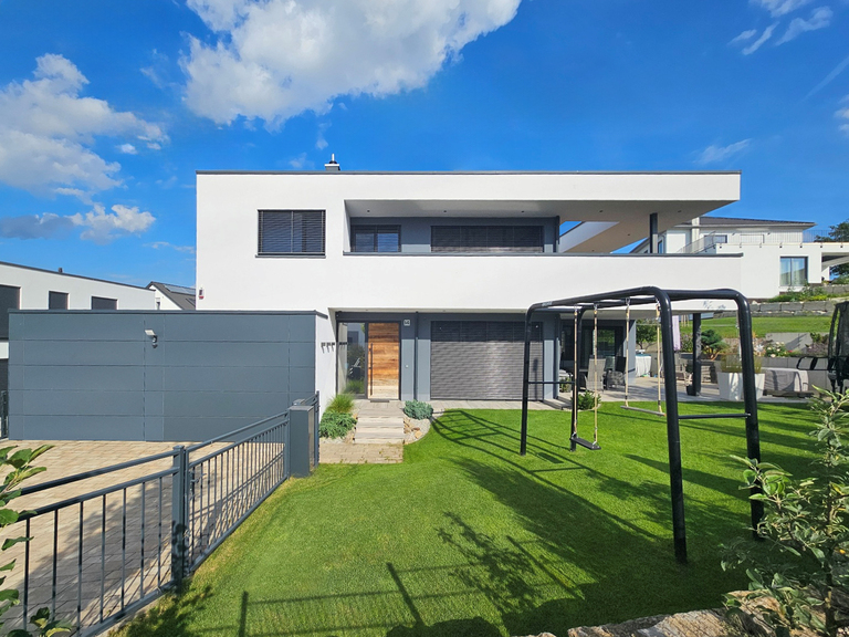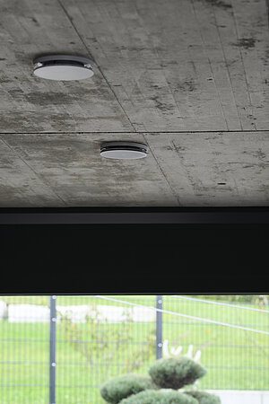 Im Keller ist das Komfort-Lüftungsgerät Zehnder ComfoAir Q verbaut und versorgt die Räume der modernen Immobilie mit frischer Luft. „Zehnder überzeugte uns in erster Linie mit seinem Enthalpietauscher, welcher bis zu 95% der in der Abluft enthaltenen Wärme zurückgewinnt und zusätzlich die Raumluftfeuchte angenehm reguliert.“, bekräftigt der Bauherr. Vom Keller aus transportiert das in die Decke einbetonierte und damit unsichtbare Luftverteilsystem frische Luft in alle Räume und führt verbrauchte Luft nach draußen ab.