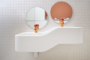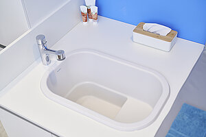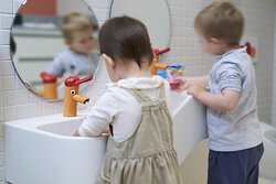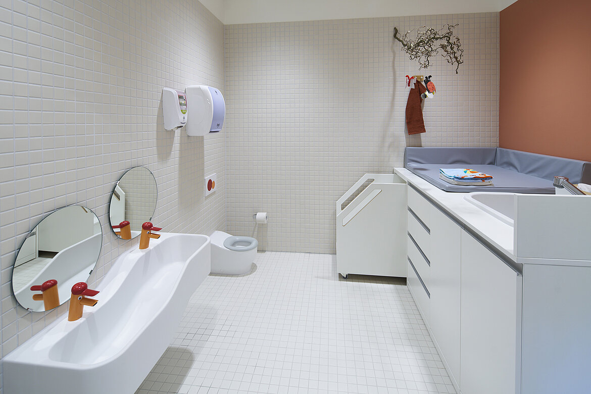 Ein Highlight sind die aus Mineralwerkstoff gefertigten Waschtischlandschaften der Serie Bambini. Unterschiedliche Höhen ermöglichen es, dass Einjährige- ebenso wie Dreijährige bequem an den Becken stehen können. Dazwischen sorgt eine kleine Wasserrutsche für spielerische Freude beim Händewaschen. „Die samtweiche Oberfläche fühlt sich für die Kinder angenehm an – und für uns ist entscheidend, dass sie hygienisch, widerstandsfähig und pflegeleicht ist“, berichtet Kita-Leiterin Corinna Reinauer und fügt hinzu: „Dass sich die Becken schnell und gründlich reinigen lassen, ist eine enorme Erleichterung für das Personal.“