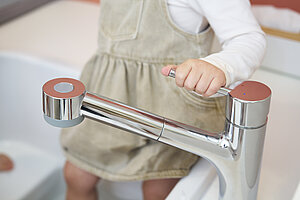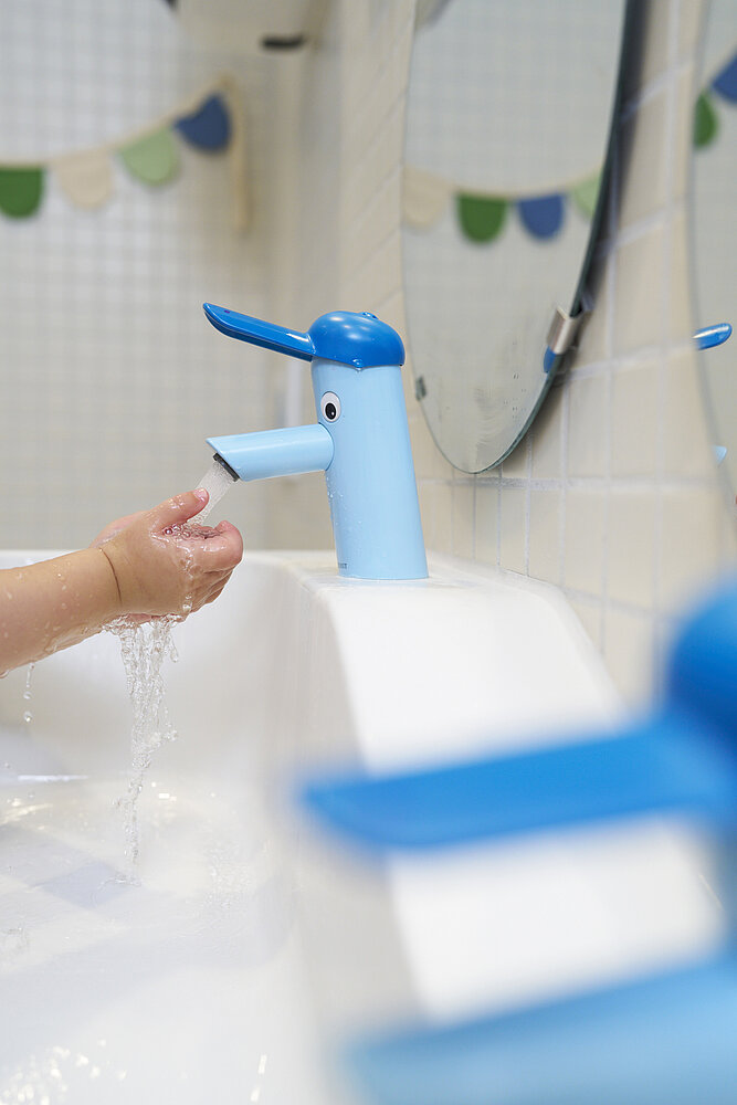 Die Armaturen der Bambini-Serie laden die Kinder zum Händewaschen ein. Mit ihrem fröhlichen, kindgerechten Design bringen sie Farbe und Spaß in die Waschlandschaften. Sie sind ergonomisch geformt, in kräftigen Farbkombinationen wie Karminrot/Orange und Ozeanblau/Hellblau gehalten und erinnern an ein freundliches Gesicht mit Nase und Mütze. „Die Kinder gehen gerne Händewaschen, weil die Armaturen ansprechend aussehen und sie sie selbst bedienen können“, berichten die Erzieherinnen. Neben dem spielerischen Aspekt überzeugt die Bambini-Serie auch durch ihre Sicherheitsfeatures: Ein integrierter Verbrühschutz sorgt dafür, dass die Wassertemperatur stets im sicheren Bereich bleibt – ein wichtiger Beitrag zur Unfallprävention im Kita-Alltag.
