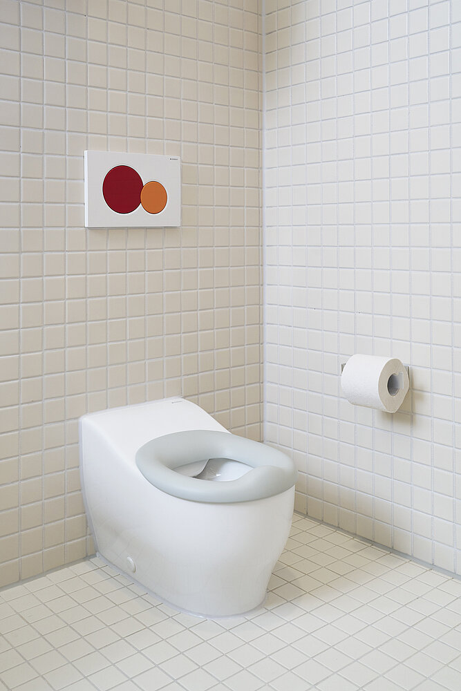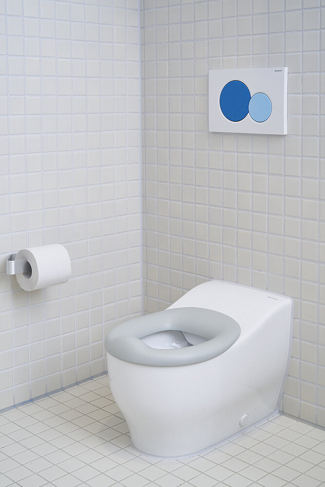 Passend dazu wurden runde Betätigungsplatten vom Typ Geberit Sigma01 in kräftigen Farbkombinationen Karminrot/Orange oder Ozeanblau/Hellblau installiert. „Die Kinder finden sich sofort zurecht, weil die