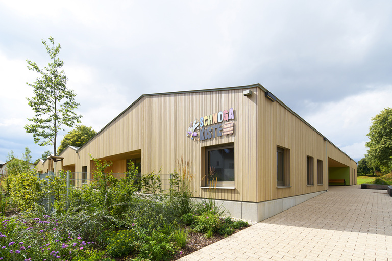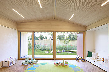 Die Gemeinde wählte eine Holzständerbauweise, ergänzt durch Lehmwände und großzügige Glasflächen. So ist ein nachhaltiges Gebäude mit einem gesunden Raumklima entstanden. „Die Holzbauweise spart CO₂ und schafft gleichzeitig eine behagliche Atmosphäre“, so Gonser. Eine Umgebung, die Wärme, Natürlichkeit und Offenheit vermittelt, sollte den Kindern von Anfang an Sicherheit geben.