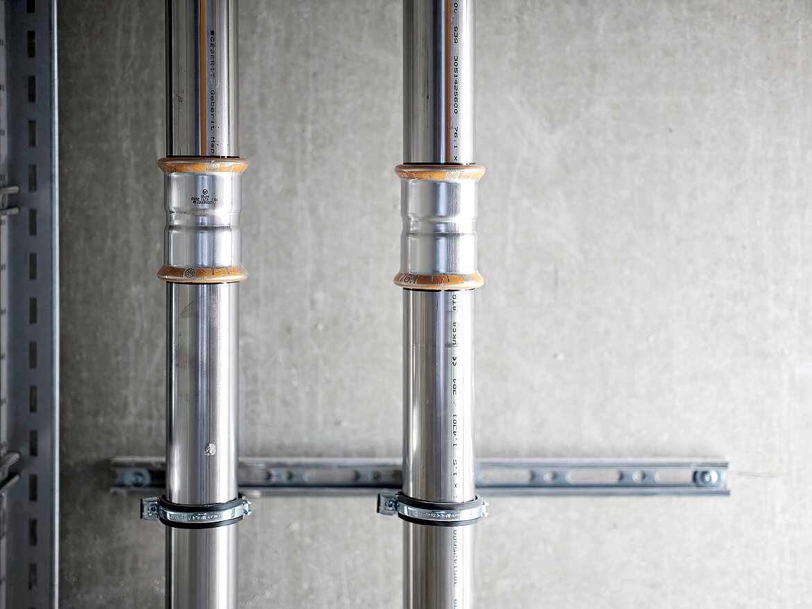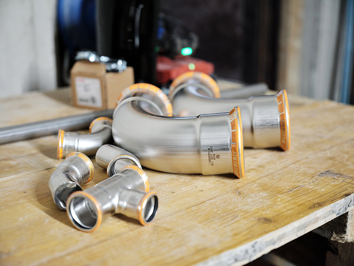 Umgesetzt wurde das Projekt mit dem neuen Geberit Mapress Therm. Das niedrig legierte Edelstahlpresssystem besteht aus CrTi Edelstahl 1.4520. Als wirtschaftliche und zugleich korrosionsbeständige Lösung eignet sie sich gut für Einsatzbereiche beim Heizen und Kühlen, bei denen mit Feuchtigkeitseinwirkungen von außen zu rechnen ist. Hauptanwendungsbereiche sind geschlossene Heiz- und Kühlkreisläufe mit und ohne Frostschutzmittel sowie Solar-, Fernwärme und Druckluftanwendungen. Das vielseitige System punktet insbesondere bei Anwendungen mit Temperaturdifferenzen und wird gleichermaßen in der Haus- und Gebäudetechnik sowie in industriellen Anwendungen und Wohnanlagen eingesetzt. Leon Walter erklärt: „Als nichtrostendes Rohrleitungssystem spielt das neue Mapress Therm auch in der Unterputzverlegung seine Vorteile aus. Außerdem können wir auf bereits vorhandene Werkzeuge bei der Verarbeitung zurückgreifen und sind in der Anwendung erprobt.“