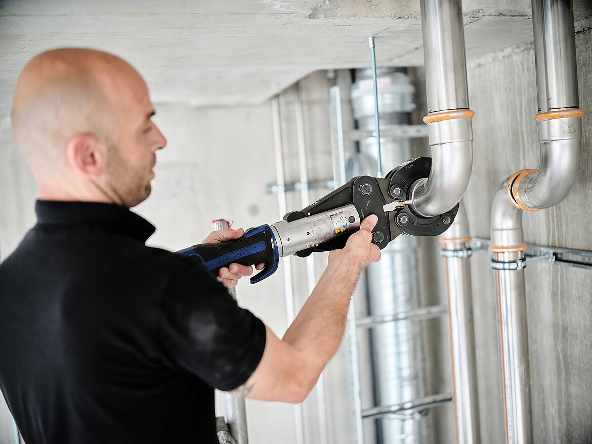 Danijel Pupic, Installateur beim Sanitärunternehmen Mergenthaler Zerweck GmbH, arbeitet schon seit Jahren mit verschiedenen Geberit Mapress-Systemen. Er schätzt die einfache Verarbeitung mit wenigen Werkzeugen sowie die hohe Sicherheit: Unverpresste Fittings werden durch die Pressindikatoren angezeigt, die erst nach der korrekten Verpressung leicht zu entfernen sind. Zudem sind durch den speziellen Konturdichtring nicht korrekt verpresste Verbindungen bei der Druckprüfung undicht und damit gut zu erkennen.