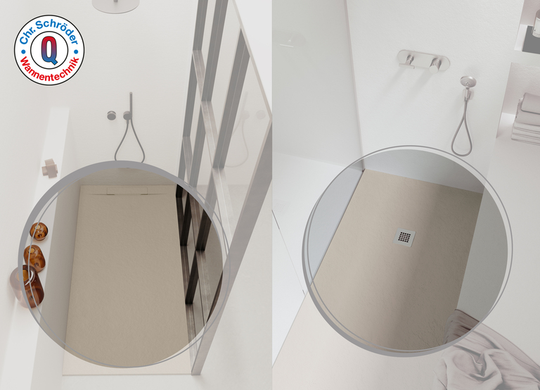 Die Slatestone L Modelle besitzen ein flächenbündiges Edelstahl-Ablaufgitter, welches auch in der jeweiligen Wannenfarbe sowie in RAL-Tönen erhältlich ist. So verschmelzen Wanne und Ablauf noch mehr zu einer fließenden Einheit.