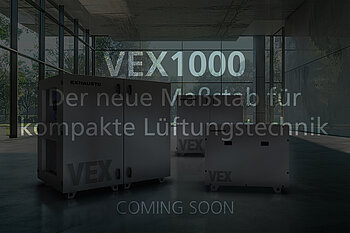 VEX1000 R mit Rotationswärmetauscher. Sie umfasst insgesamt elf Modelle mit einer Leistungsbreite von 850 m3/h bis 8.650 m3/h. Im Jahresverlauf 2025 werden weitere Baureihen folgen, unter anderem die VEX1000 C mit Gegenstromwärmetauscher.