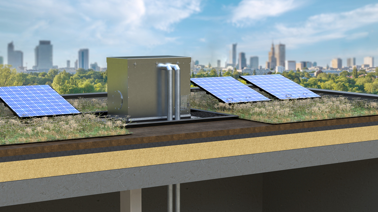 Mit der AWN Basic Mini zeigt Aereco, wie sich unvermeidbare Abwärme aus der Lüftung für die Aufbereitung von Warmwasser und Heizung im Geschosswohnungsbau wirkungsvoll nutzen lässt. Die integrierten Wärmeübertrager übertragen die unvermeidbare Abwärme auf kalte Sole. Mittels spezieller Wärmepumpentechnik wird die Abwärme auf dem gewünschten Temperaturniveau an das Gebäude zurückgegeben. Die sehr kompakten Gehäuseabmessungen und der geringe Platzbedarf lassen reichlich Spielraum zur flexiblen Nutzung der Dachfläche für Photovoltaik oder Begrünung.