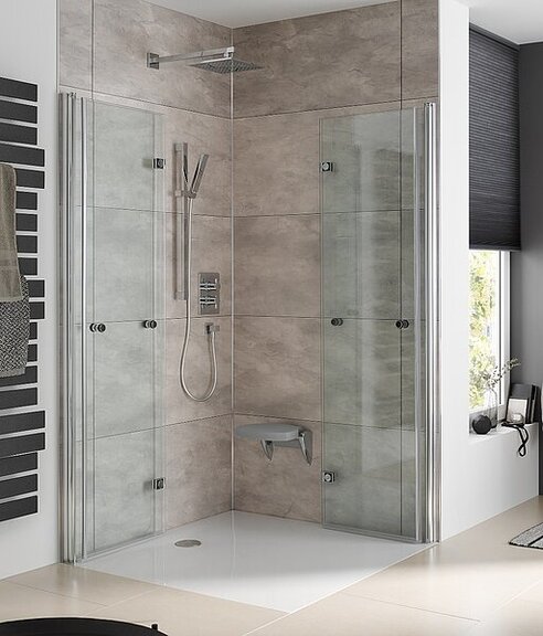 Alle Einbauvarianten der Drehfalttüren punkten mit einer ausgefeilten Technik, die in jedem noch so beengten Bad eine komfortable Duschkabine ermöglicht: Ihre Scharniere sind pendelbar und mit verchromten Drehlagern ausgestattet. So lassen sie sich nicht nur weiträumig öffnen und garantieren einen großzügigen Einstieg in die Duschkabine, sondern können komplett vor der Wand zusammengefaltet werden. Auch die Echtglaselemente der Duschserien – bei der Exklusiv und Walk In Exklusiv 6 mm, Atelier Plan sowie K2 und K2P 8 mm stark – vergrößern das Badezimmer optisch. Auf diese Weise sind Duschkabinen mit Drehfalttüren besonders gut für Klein- und Schlauchbäder geeignet.