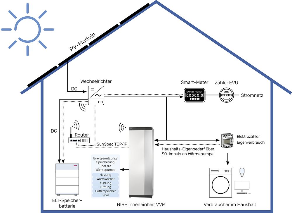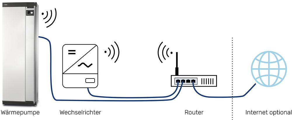 Wärmepumpen der NIBE S-Serie können direkt mit einem geeigneten Wechselrichter oder einem anderen Energiemanager kommunizieren. Die Kommunikation erfolgt über das Heimnetzwerk mit oder ohne Kabel. NIBE empfiehlt für diese Funktion die Verwendung ausgewählter Wechselrichter, zum Beispiel die der Hersteller Fronius, Kostal, SMA oder Solar Edge. Die erforderliche Datenkommunikation ist durch NIBE geprüft und diese Wechselrichter werden von der NIBE Wärmepumpe erkannt