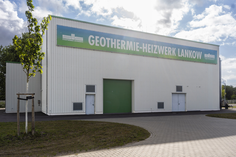 In Schwerin fließt auf etwa 1.300 Metern Tiefe 56 °C warmes, salzhaltiges Thermalwasser durch einen porösen Sandstein, der sich vor 200 Millionen Jahren abgelagert hat. Über eine Förderbohrung wird diese Sole an die Oberfläche gebracht und gefiltert. Über Wärmetauscher wird die Wärme ausgekoppelt und anschließend durch vier Hochleistungswärmepumpen auf bis zu 82 °C erhöht. Diese Temperatur wird an ein geschlossenes Heizsystem übergeben. „Mit unserer ersten Geothermie-Anlage sind wir einen entscheidenden Schritt in Richtung klimaneutrale Wärmeversorgung gegangen“, meint Hanno Nispel, Geschäftsführer Stadtwerke Schwerin.