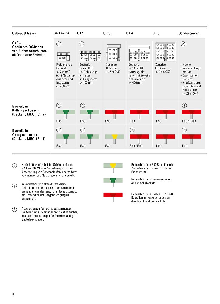 Die in der Übersichtstabelle geforderten Feuerwiderstandsdauern für Bodenabläufe sind bei der Planung und Ausführung zu berücksichtigen. Der Nachweis der jeweiligen Feuerwiderstandsdauer muss über einen An- / Verwendbarkeitsnachweis, z. B. ein allgemeines bauaufsichtliches Prüfzeugnis (abP), eine allgemeine bauaufsichtliche Zulassung (abZ) oder eine allgemeine Bauartgenehmigung (aBG) geführt werden. Europäische Klassifizierungen gelten auch für Bodenabläufe, die nach europäischen Normen geregelt und in der Muster Verwaltungsvorschrift Technische Baubestimmungen(MVV TB) dokumentiert sind.