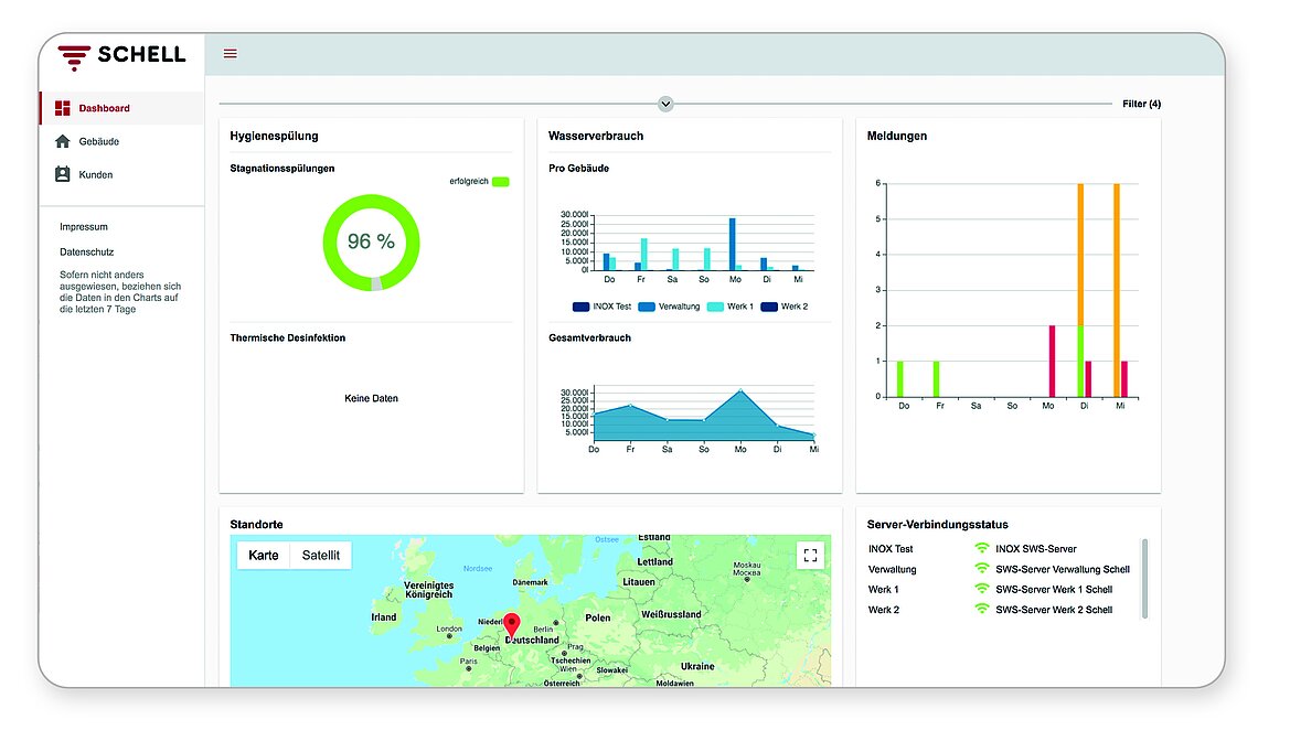 In der übersichtlichen Visualisierung von SMART.SWS werden sämtliche relevanten Daten aller Gebäude schnell erfassbar dargestellt und dokumentiert. Das erleichtert die Verwaltung, die Planung von Reparatur- und Wartungseinsätzen sowie den Nachweis der Einhaltung gesetzlicher Anforderungen. Bilder: Schell GmbH & Co. KG