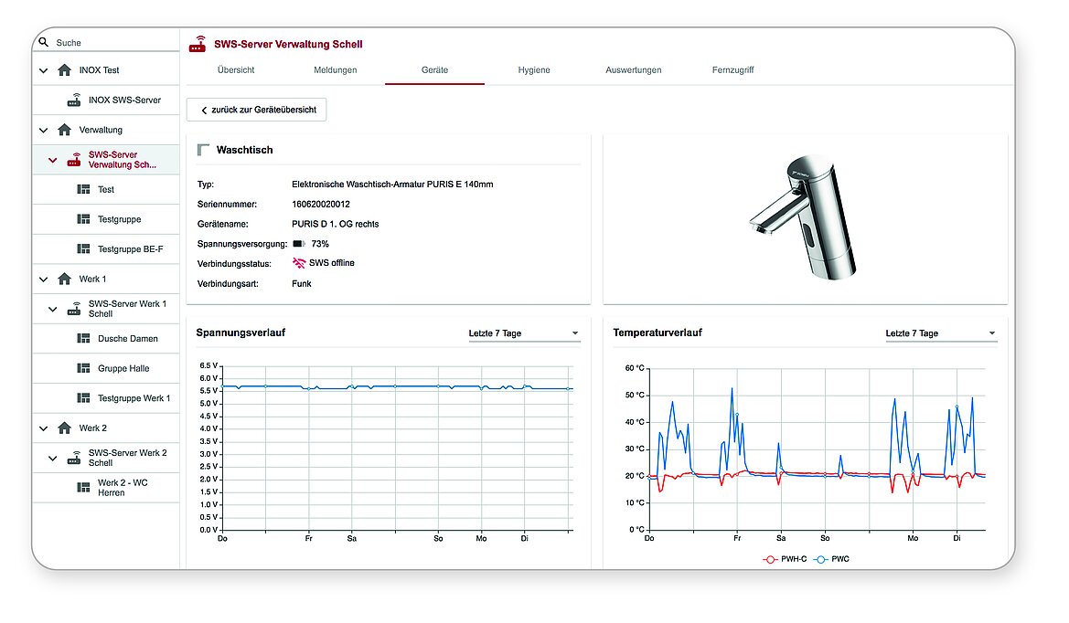 Für ein noch effizienteres Facility Management bietet SCHELL mit SMART.SWS eine browserbasierte Erweiterung, die einen ortsunabhängigen sowie gebäudeübergreifenden Fernzugriff auf alle vernetzten SWS-Anlagen, Armaturen sowie relevanten Systemdaten und Betriebsparameter ermöglicht – in Sekundenschnelle und bequem per Smartphone, Tablet oder PC im Home Office. In der smarten Cloud-Lösung werden sämtliche Daten zu Stagnationsspülungen, Temperaturverläufen, Wassermengen und Batteriestatus grafisch aufbereitet, sodass eine einfache Analyse und Optimierung möglich sind. Auch etwaige Systemmeldungen, z. B. ein niedriger Batteriestatus, sind in SMART.SWS auf einen Blick ersichtlich. So können Betreiber bei Bedarf zeitnah das Facility Management vor Ort auf den Plan rufen. Wartungs- und Reparatureinsätze können dadurch zeitsparend und vorausschauend geplant werden. Die Vergabe von Benutzerrollen mit individuellen Zugriffsrechten ermöglicht eine sichere und strukturierte Verwaltung. Darüber hinaus werden sämtliche Analysedaten und durchgeführte Stagnationsspülungen gespeichert und dokumentiert – eine immense Arbeitserleichterung, da gerade das Monitoring und die Dokumentation die beiden größten aktuellen Herausforderungen im Facility Management sind, wie eine Studie der Wirtschaftsprüfungs- und Beratungsgesellschaft PwC[1] zeigt. Mit SMART.SWS haben Betreiber alle Liegenschaften auf einer Plattform zentral im Blick und können ihre Facility-Management-Prozesse effizient steuern, frühzeitig Optimierungspotenziale erkennen und den Verwaltungsaufwand erheblich reduzieren.