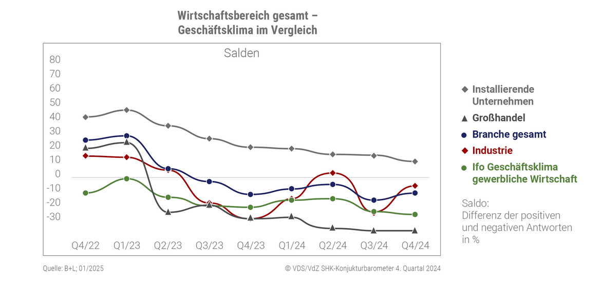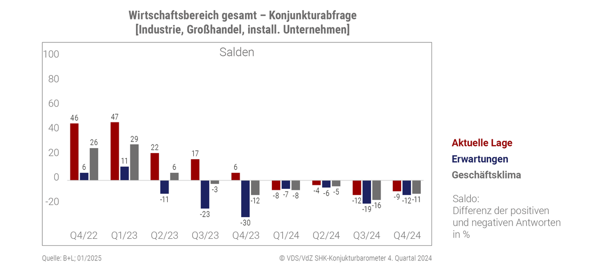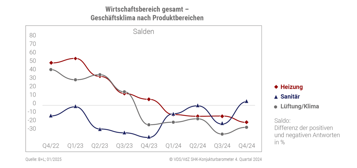 Während der Bereich Heizung im Jahr 2023 noch positive Impulse zeigte, kam es im Jahr 2024 zu einem sich verfestigenden Einbruch der Heizungsabsätze (Q4: -20). Auch der Bereich Lüftung/Klima befindet nach wie vor sich trotz leichter Erholungstendenzen im negativen Bereich (Q4: -26). Anders verhielt es sich im Sanitärbereich. Aktuell liegt der Sanitärbereich mit einem Saldo von +5 als einziger Produktbereich im positiven Bereich.