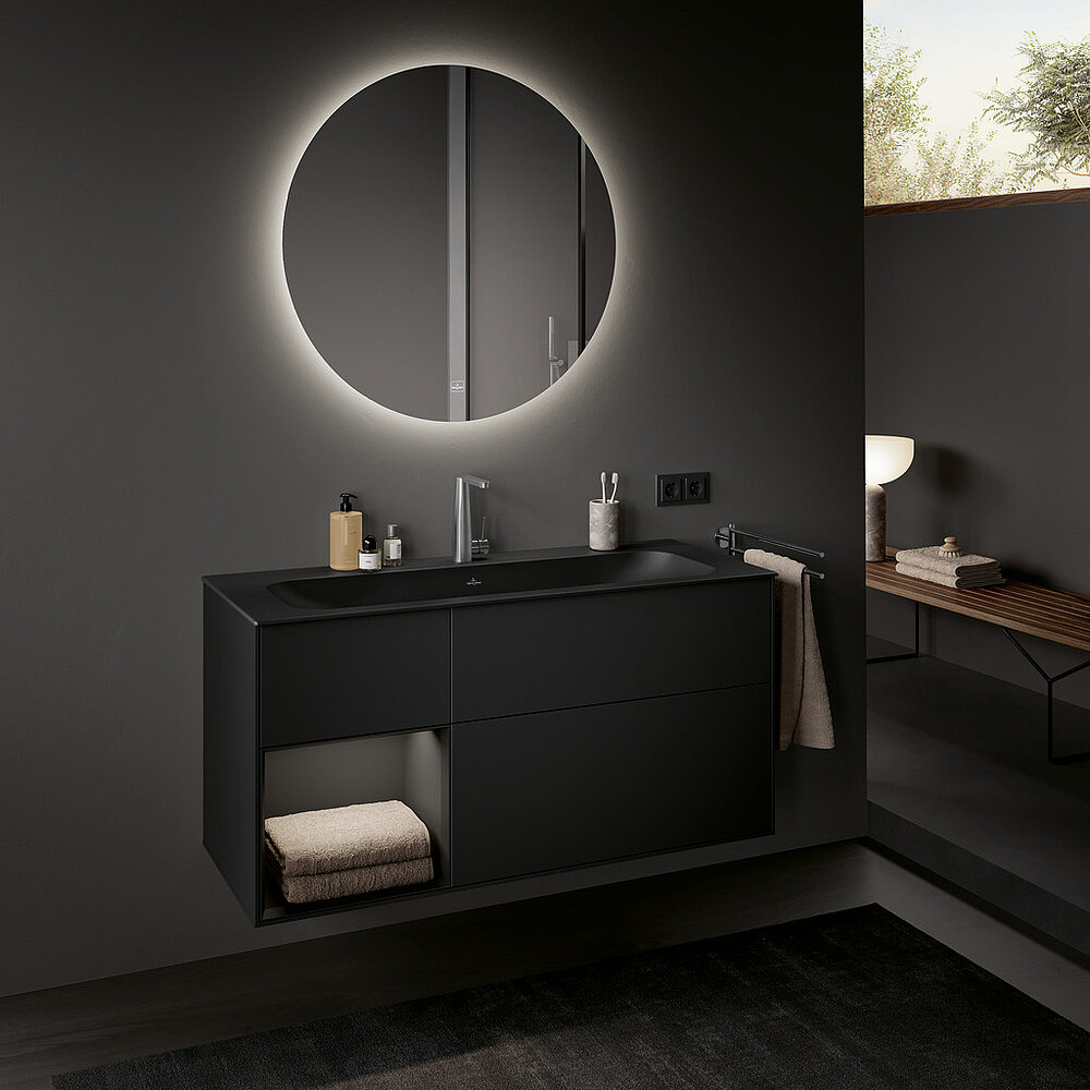 Perfekt ergänzt wird das schwarze Bad-Ensemble durch die minimalistischen Finion- Möbel, die sich mit klaren Linien, grifflosem Design und ein stimmungsvollen Beleuchtungskonzept nahtlos in das All-Black-Thema einfügen. Ob modulare Waschtischunterschränke, Hoch- und Seitenschränke, Regale oder Spiegel - jedes Teil passt formal und farblich perfekt in die ausdrucksstarke Badkonzeption.