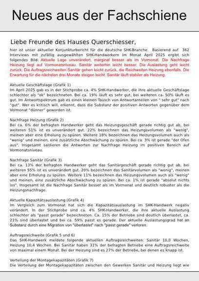 Inhalte der aktuellen Ausgabe sind (1) die Konjunktur im SHK-Handwerk , (2) Nachfrage Sanitär & Heizung (3) Kapazitätsauslastung, (4) Auftragsreichweite (4) Montagekapazitäten.