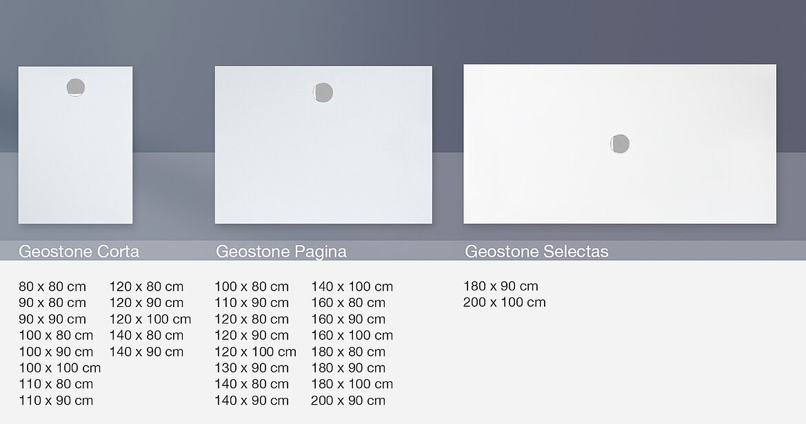 Eine Ablaufabdeckung in der Farbe des Wannenmaterials - schneeweiß matt oder weiß Glanz - ist exklusive wählbar. Die Ablaufposition befindet sich bei dem Modell Geostone Corta mittig am oberen Rand der kurzen Seite und bei unserem neuen Modell Geostone Pagina an der langen Seite. Einzig bei dem Modell Geostone Selectas, welches in den Größen 180 x 90 cm und 200 x 100 cm erhältlich ist, sitzt der Ablauf zentral in der Mitte der Duschwanne.