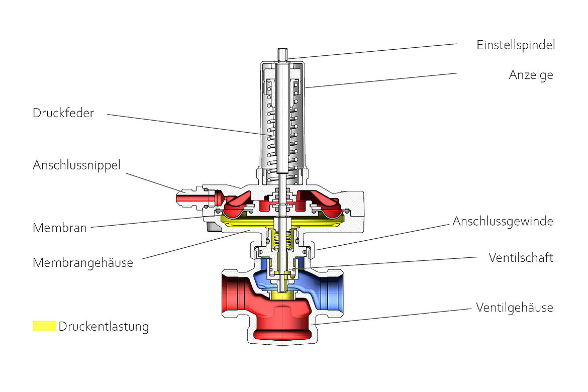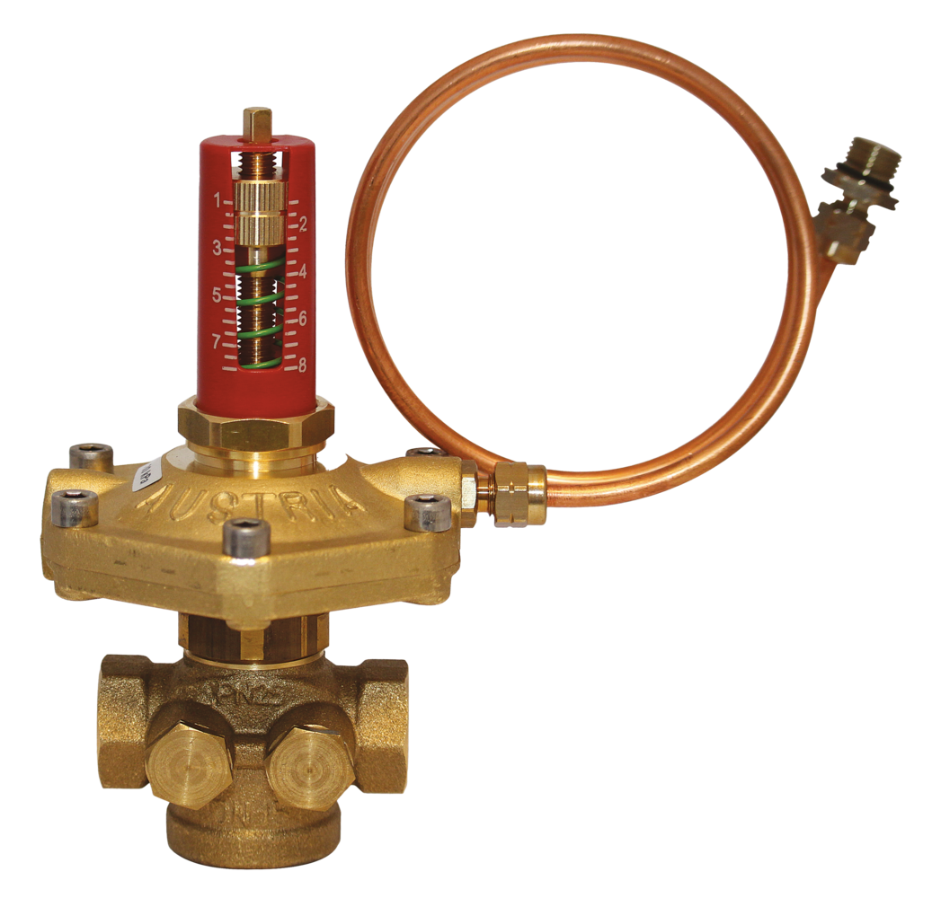 Differenzdruckregler regeln den Druckunterschied zwischen dem Vor- und Rücklauf eines Systems, indem sie den Durchfluss des Heizungs- oder Kühlmediums in einer Anlage mit dem richtigen Druck anpassen. Schließt man ein Thermostatventil am Heizkörper, fehlt ein Widerstand im System, wodurch andere Anlagenteile mehr Durchfluss erhalten. Der Differenzdruckregler reagiert automatisch auf diese Veränderungen und öffnet bzw. schließt sich je nach Anlagensituation. Somit werden alle Anlagenteile jederzeit mit der gerade erforderlichen Energiemenge versorgt.