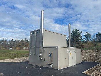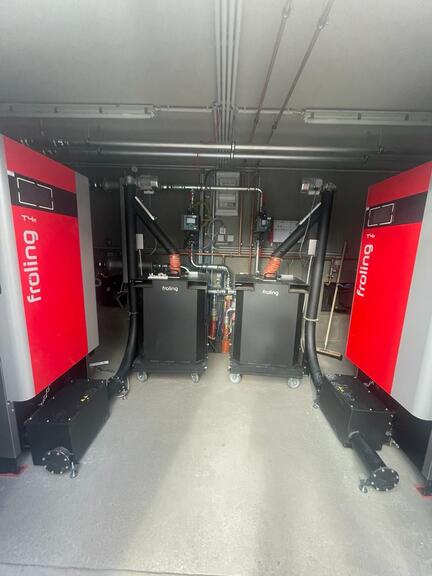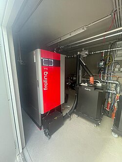 Die moderne Biomasseanlage wurde platzsparend und wartungsfreundlich in Containerbauweise im Außenbereich realisiert – eine flexible und effiziente Lösung, die sich optimal in die bestehenden Betriebsstrukturen integrieren lässt. Die beiden Fröling T4e-Kessel arbeiten im Kaskadenbetrieb und sorgen so für höchste Betriebssicherheit, optimale Auslastung und maximale Effizienz, selbst bei schwankendem Wärmebedarf.