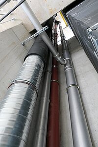 Edelstahl V4A ist auch das Material des Rohrsystems. Es basiert auf ACO Pipe Edelstahlrohren in den Dimensionen DN 100 bis DN 315. Die Entscheidung für Edelstahl V4A anstelle von verzinktem Stahl war insbesondere aufgrund der chemischen Belastung durch das Gründach erforderlich. Im Substrat von Dachbegrünungen entstehen durch biologische Abbauprozesse organische Säuren, darunter Fulvosäuren, die in Kontakt mit Wasser in sehr geringer Konzentration gelöst werden können. Edelstahl V4A ist dank seines erhöhten Molybdängehalts besonders widerstandsfähig gegenüber diesen Einflüssen. Zusätzlich wurden die Rohrleitungen mit Armaflex gedämmt, um Wärmeverluste zu reduzieren und Kondenswasserbildung zu vermeiden. Vervollständigt wird die langlebige und widerstandsfähige Entwässerungslösung von ACO Haustechnik durch die Ausstattung mit einer Begleitheizung: sie verhindert das Einfrieren des Wassers in den Fallleitungen und sorgt für einen störungsfreien Betrieb auch bei frostigen Temperaturen. Und natürlich erfüllt das Entwässerungssystem auch die Anforderungen an den Brandschutz: Gemäß den