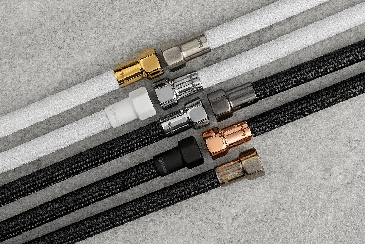 Einteilige, nahtlos in den Schlauch übergehende Überwurfmuttern runden das exklusive Design der Schläuche ab. Die dazu wählbaren Farben sind Schwarz, Weiß, Verchromt, Gold, Roségold, Antikes Bronze, Schwarzstahl und Gebürsteter Stahl