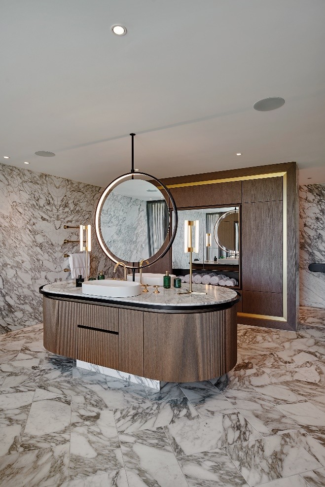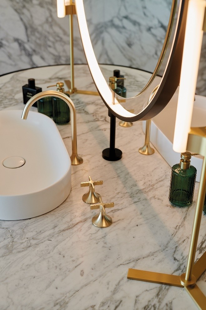 Exklusivität und Stilbewusstsein kennzeichnen auch die drei Bäder. Das Hauptbad erweist sich als luftig und luxuriös: Grauweiß gemaserter Marmor und ein ovaler, mit dunklem Holz verkleideter Waschtisch verleihen ihm vollendete Eleganz. Vaia in Messing gebürstet (23kt Gold) von Dornbracht ist eines von mehreren Goldelementen, die gekonnte Kontraste setzen, zum Beispiel am Waschbecken oder in der Dusche. Ganz anders gestaltet ist dagegen das zweite Bad: Durch die Oberfläche in Dark Platinum gebürstet wird Vaia hier eins mit dem schwarzen Raumdesign. Lediglich weiße Fliesenfugen sorgen für einen dezenten, aber prägnanten visuellen Bruch. Im kleinen Gästebad ist Vaia abermals in Messing gebürstet (23kt Gold) zu finden – und ergänzt dort die edle Stofftapete mit ihren stilisierten Flamingos und Tropenpflanzen.