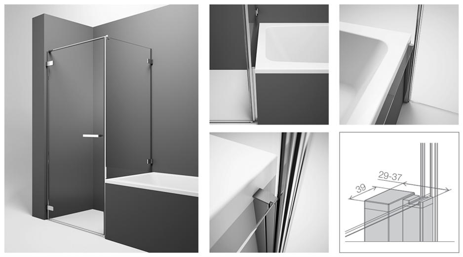Bei dieser Variante wird die Seitenwand direkt auf der Badewanne montiert. Der Ausschnitt für die Badewanne erfordert keine weiteren Profile und ist damit eine stillvolle Lösung für unsere rahmenlosen Serien NIESTE und TRAVE RL.