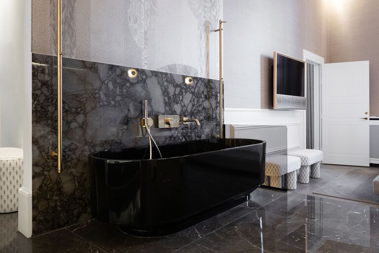Angesichts seines Fokus auf Präzision, Handwerkskunst und Gastfreundlichkeit war es naheliegend, dass das Park Lane Copenhagen in den Badezimmern auf Armaturen und Duschen von AXOR zurückgreift. In der Hilliger MasterSuite harmonieren tiefschwarzer Marmor, eine Badewanne und zwei Waschbecken mit verschiedenen Armaturen in strahlendem Brushed Brass. Die Wanne glänzt mit einer außergewöhnlichen Kombination aus einem wandmontierten AXOR One Thermostatmodul, einer AXOR Starck Handbrause und einem AXOR Citterio Wannenauslauf. Beim Doppelwaschbecken entschieden sich die Designer für AXOR Citterio C Armaturen mit strukturierter Griffoberfläche.