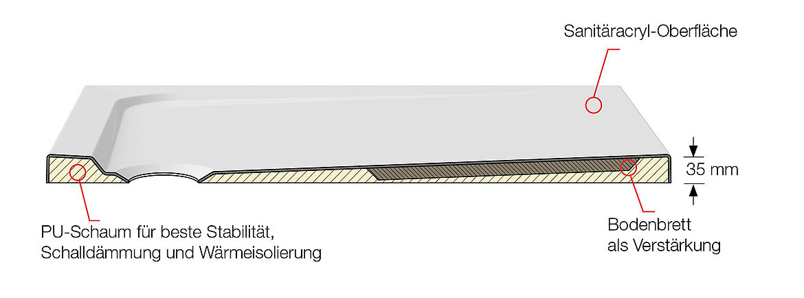 Durch die Hinterfütterung der Acryl-Wanne mit PU-Schaum bekommt ARTFLOOR besondere Eigenschaften im Vergleich zu herkömmlichem Acryl: