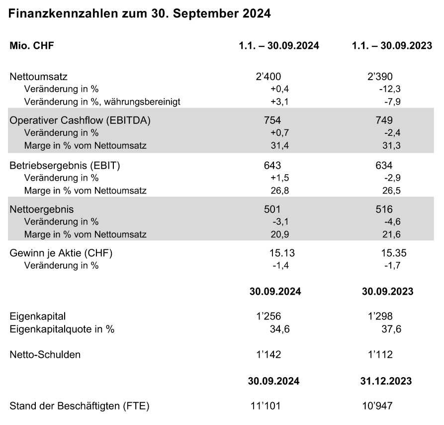 Insgesamt stieg der operative Cashflow (EBITDA) um 0,7% auf CHF 754 Mio., währungsbereinigt resultierte eine deutlichere Zunahme von 4,6%. Die EBITDA-Marge nahm gegenüber der Vorjahresperiode um 10 Basispunkte auf 31,4% zu; währungsbereinigt resultierte ein Plus von 50 Basispunkten. Das Betriebsergebnis (EBIT) erhöhte sich um 1,5% auf CHF 643 Mio. (währungsbereinigt +5,9%), entsprechend einer EBIT-Marge von 26,8% (Vorjahr 26,5%). Das Nettoergebnis nahm um 3,1% auf CHF 501 Mio. ab (währungsbereinigt +1,3%), was einer Nettoumsatzrendite von 20,9% (Vorjahr 21,6%) entspricht. Grund für den Rückgang des Nettoergebnisses war die deutlich höhere Steuerrate, die hauptsächlich durch die seit 2024 gültige OECD-Mindestbesteuerung getrieben war. Beim Gewinn je Aktie führten die positiven Effekte der Aktienrückkaufprogramme dazu, dass die Abnahme im Vergleich zur Entwicklung beim Nettoergebnis geringer war. Der Gewinn je Aktie sank um 1,4% auf CHF 15.13 (Vorjahr CHF 15.35); in lokalen Währungen nahm er um 3,1% zu. Der Free Cashflow stieg um 1,2% auf CHF 426 Mio. - dies trotz des sehr anspruchsvollen Umfelds; dabei kompensierten die positiven operativen Ergebnisse und tiefere Investitionen die negativen Effekte aus der Veränderung des Nettoumlaufvermögens.