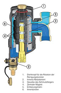 Die Reinigungswirkung der Armatur basiert auf drei Stufen: doppelte Filterwirkung dank zwei radial angeordneter Trenngewebe, ein zentraler Magnet und ein Schmutzfänger im Auslass.