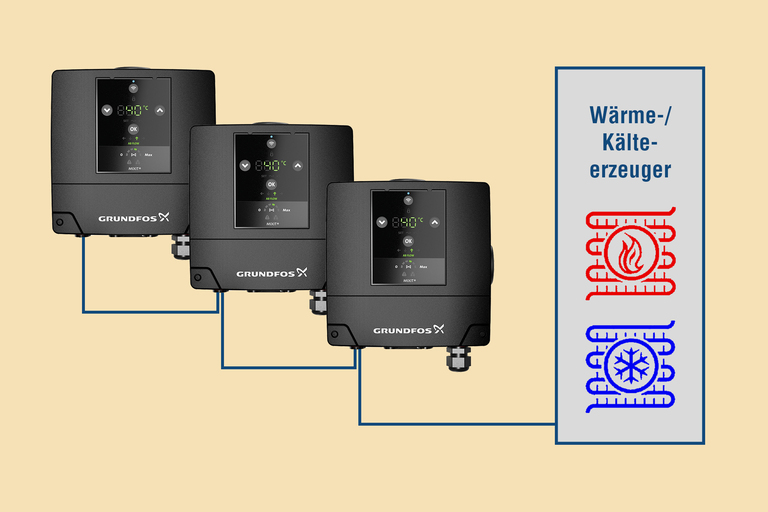 Besonders interessant ist die neue Sollwert-Funktion beim Betrieb mehrerer Mischkreise. Die Regeleinheiten können zu einer Kaskade zusammengeschlossen werden, bei der der Wärme- bzw. Kältebedarf zwischen den Einheiten intelligent abgeglichen wird. In der Kaskade bestimmt dann der Mischkreis mit dem höchsten Energiebedarf automatisch den Sollwert der Energiequelle. Die Einrichtung einer Kaskade aus mehreren Mixit-Einheiten erfolgt ebenfalls über die Grundfos GO App. Einmal eingestellte Sollwerte lassen sich dabei einfach auf die anderen Einheiten übertragen.