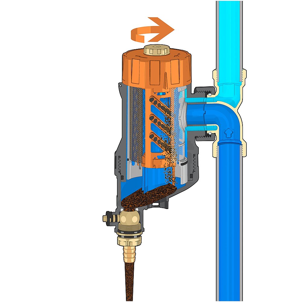 Die Reinigungswirkung der Armatur basiert auf drei Stufen: doppelte Filterwirkung dank zwei radial angeordneter Trenngewebe, ein zentraler Magnet und ein Schmutzfänger im Auslass. So schützt der speziell für hohe Volumenströme in Wärmepumpenanlagen ausgelegte magnetische Schmutz- und Schlammabscheider Komponenten und Bauteile vor der verschleißenden Wirkung der im Wärmeträger enthaltenen Verunreinigungen. Über einen internen Mechanismus reinigen Bürsten das Filtergewebe ohne Demontage. Die Reinigungswirkung der Armatur basiert auf drei Stufen: doppelte Filterwirkung dank zwei radial angeordneter Trenngewebe, ein zentraler Magnet und ein Schmutzfänger im Auslass.