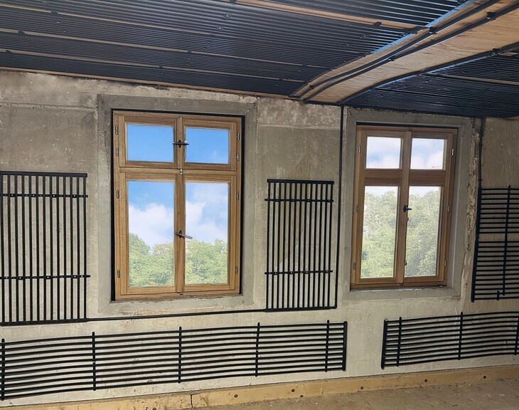 „Bei der Sanierung des Dornröschenhauses war es uns wichtig, eine Heizlösung zu finden, die effizient arbeitet, aber gleichzeitig die historische Bausubstanz schont. Mit aquatherm black haben wir genau das erreicht“, so Bauherr Thilo Juhnke-Wild. Denn: Der Einsatz von aquatherm black bietet insbesondere bei der Sanierung historischer Gebäude zahlreiche Vorteile. Durch die unsichtbare Integration der Heizregister bleibt die ästhetische Gestaltung der Innenräume unbeeinträchtigt. Die Installation erfolgte zudem minimalinvasiv, wodurch so wenig wie möglich in die historische Substanz des Gebäudes eingegriffen wird. Durch die Fertigung der Heizelemente in verschiedensten Maßen am aquatherm Hauptsitz im südwestfälischen Attendorn gelang es, das System passgenau an die Bedürfnisse im Dornröschenhaus anzupassen.