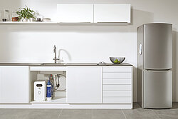 In Büroküchen ist der Wasserbedarf oft deutlich höher. GROHE Blue Professional veredelt das Wasser ganz wie die Home-Variante, ist dabei jedoch mit einer höheren Kapazität von zwölf Litern gekühltem, sprudelndem Wasser pro Stunde auf große Gruppen von bis zu 40 Personen ausgelegt. GROHE Blue Professional kann nicht nur mit den 425-g-CO2- Standardflaschen betrieben werden, sondern auch mit separat zu erwerbenden GROHE 2- kg-CO2-Flaschen - sie reichen für jeweils bis zu 350 Liter mit Kohlensäure versetztem Wasser.