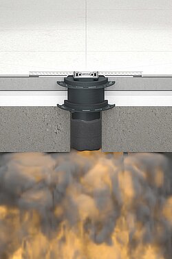 Am Brandschutzelement werkseitig fest angebracht befindet sich eine Lippendichtung, die sicher das Ausbreiten giftiger Rauchgase nach oben verhindert. Im Brandfall verschließt die integrierte Quellstoff-Einlage bei Hitzeeinwirkung die Deckendurchführung, Entwässerungsleitungen und Bodenabläufe aus Kunststoff schnell, sicher und zuverlässig. Weder Flammen noch Rauch und Hitze können sich weiter ausbreiten. Die darüber liegenden Etagen sind gegen eine Brandausbreitung abgeschottet.