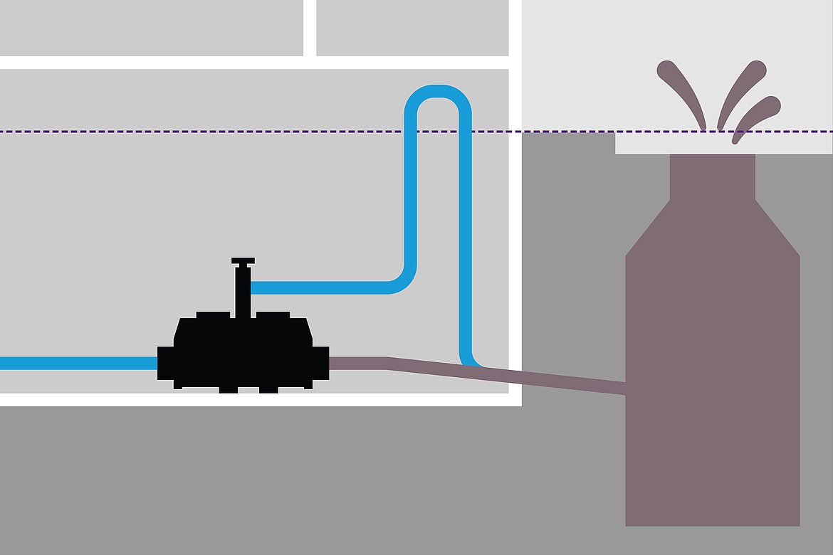 Im Normalbetrieb fließt das Abwasser mit dem Gefälle zum Kanal ohne den Einsatz von Energie ab. So ist die Abwasserentsorgung auch bei einem Stromausfall gesichert. Im Rückstaufall schließt das automatische Verschlusssystem und das Abwasser wird über eine Druckleitung mit Rückstauschleife in den Kanal gepumpt. Quelle: KESSEL