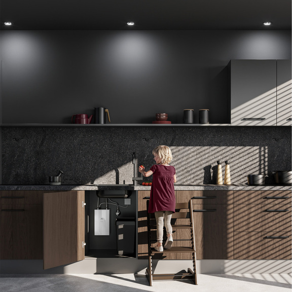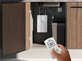 Mit seinen geringen Geräteabmessungen von 29 x 17 x 8,5 Zentimetern erfüllt der DDLE Kompakt 11/13 zeitgemäße Küchen-Trends, weil er unter dem Spültisch ausreichend Stauraum für größere Abfallbehälter zur Mülltrennung und für Reinigungsutensilien ermöglicht. Platz spart er auch unter der kleinsten Küchenspüle und in der unzugänglichsten Nische. Eine Regulierung der gewünschten Warmwassertemperatur ist trotz alledem ganz einfach, sie erfordert kein lästiges Bücken und bedeutet insbesondere für ältere oder bewegungseingeschränkte Nutzer zeitgemäßen Komfortgewinn: Per Fernbedienung, die bei der Ausführung DDLE Kompakt 11/13 FB serienmäßig dazugehört, lässt sich die angeforderte Warmwassertemperatur exakt und bequem regulieren: Durch Fingertipp auf das Plus- oder Minus-Bedienfeld ist die Wassertemperatur im Handumdrehen etwas wärmer oder kälter eingestellt. Darüber hinaus lassen sich zwei Temperaturen dauerhaft programmieren, die der Nutzer durch Betätigung der Bedienfelder „1“ und „2“ aktiviert.