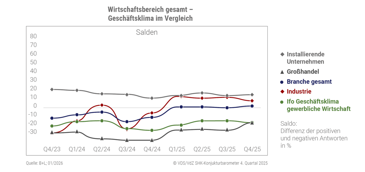 In den drei Produktbereichen zeigt sich ein differenziertes Bild: Sanitär lag im gesamten Jahr 2025 leicht im positiven Bereich und notiert aktuell bei +8. Der Bereich Heizung blieb 2025 durchweg negativ, zeigt jedoch eine Erholungstendenz und liegt im 4. Quartal 2025 bei -2. Im Bereich Lüftung/Klima zeigt sich hingegen nach zwei positiven Quartalen wieder eine Verschlechterung; das Geschäftsklima liegt aktuell bei einem leicht negativen Wert von -2.